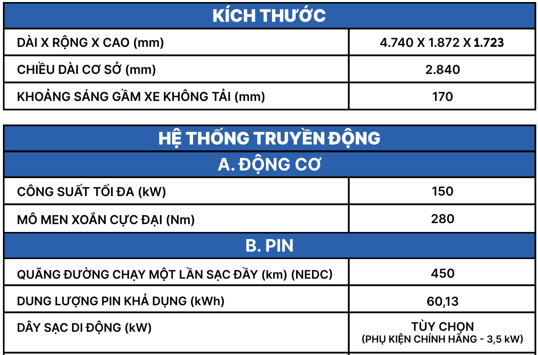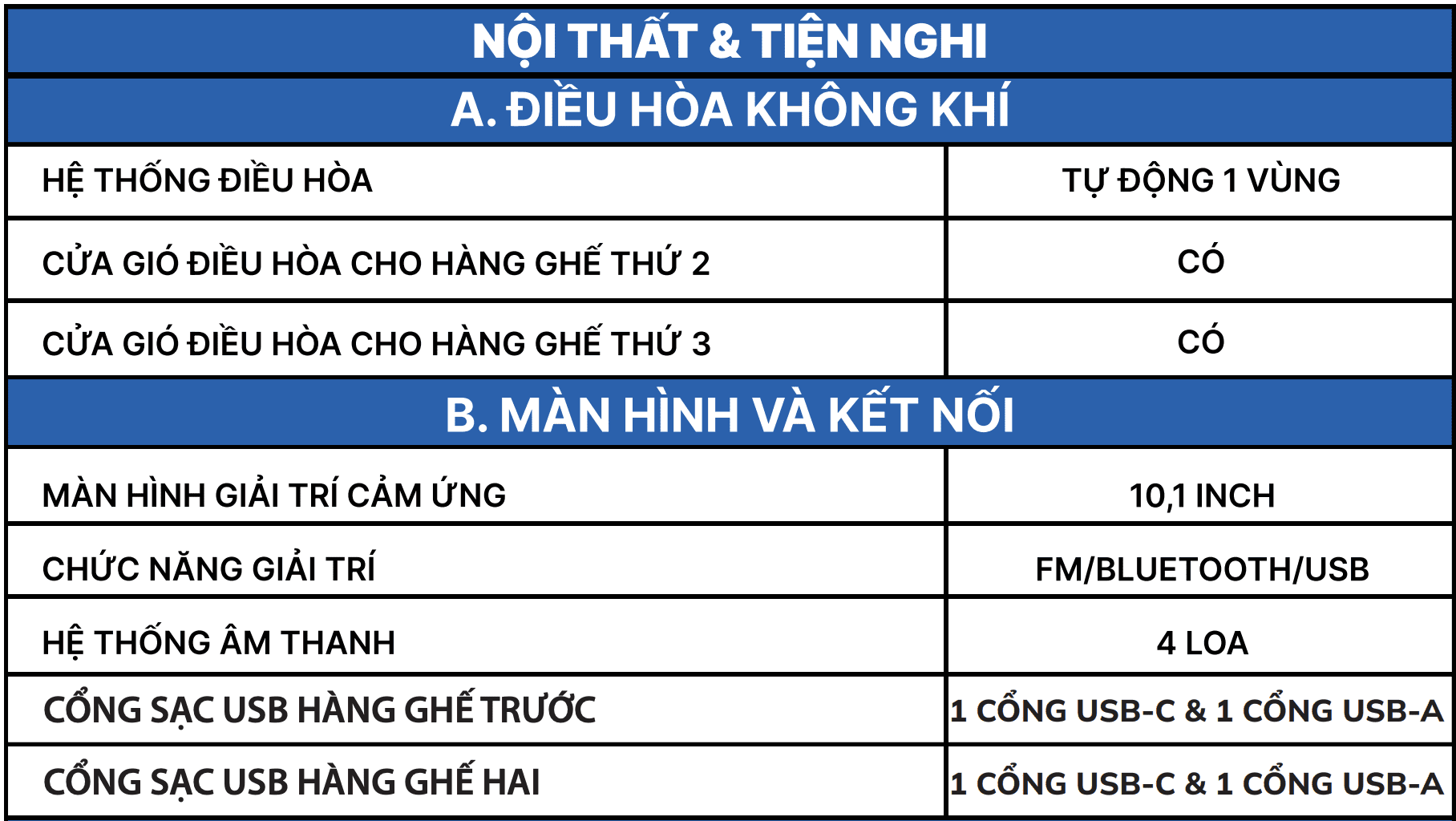Hệ thống túi khí đa điểm bảo vệ hành khách tối đa khi xảy ra va chạm.Thông số kỹ thuật