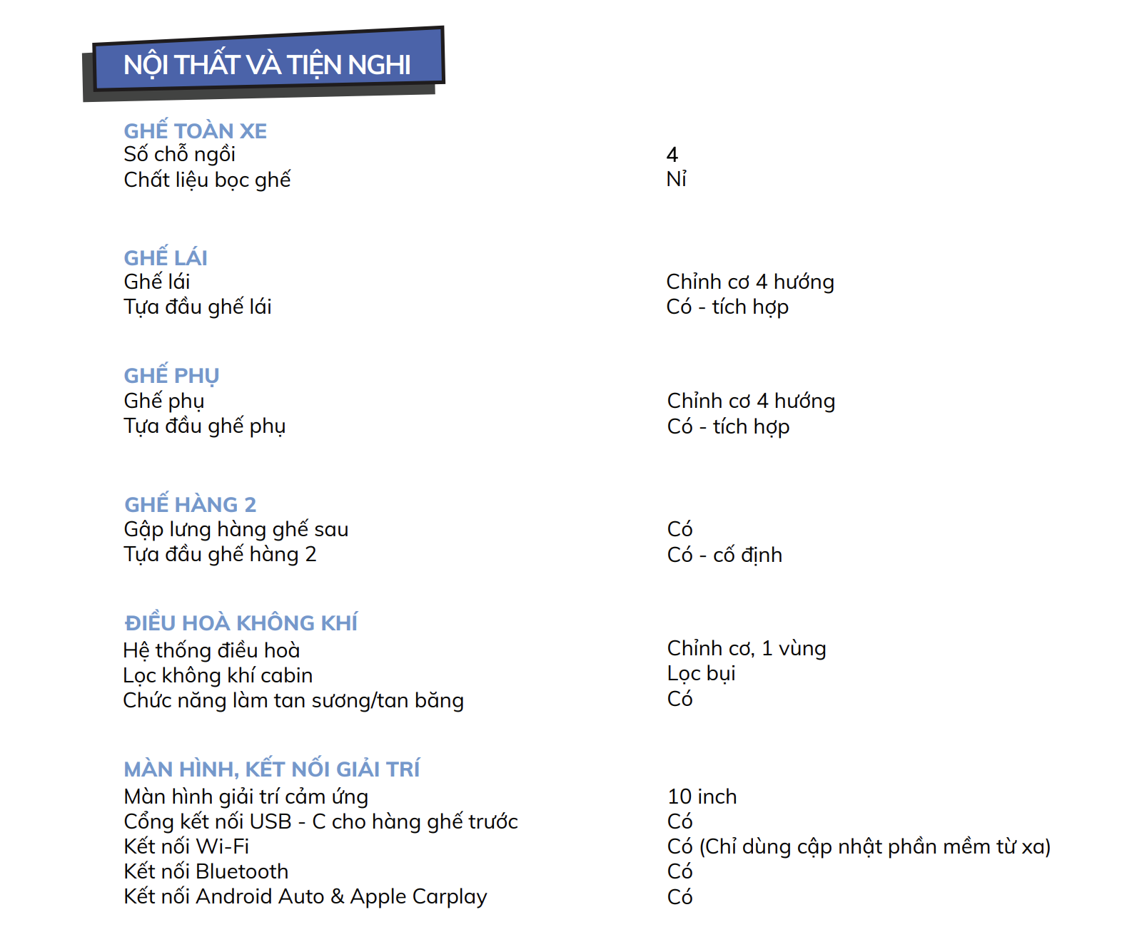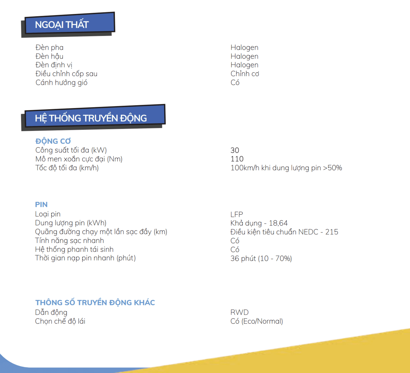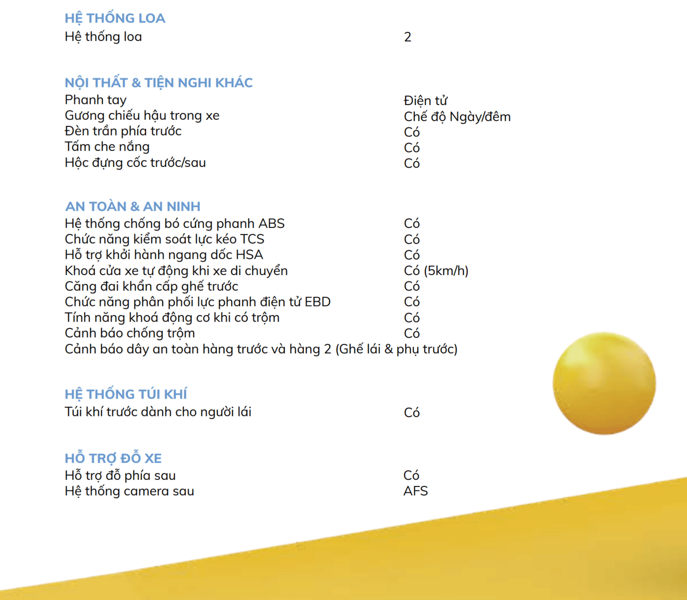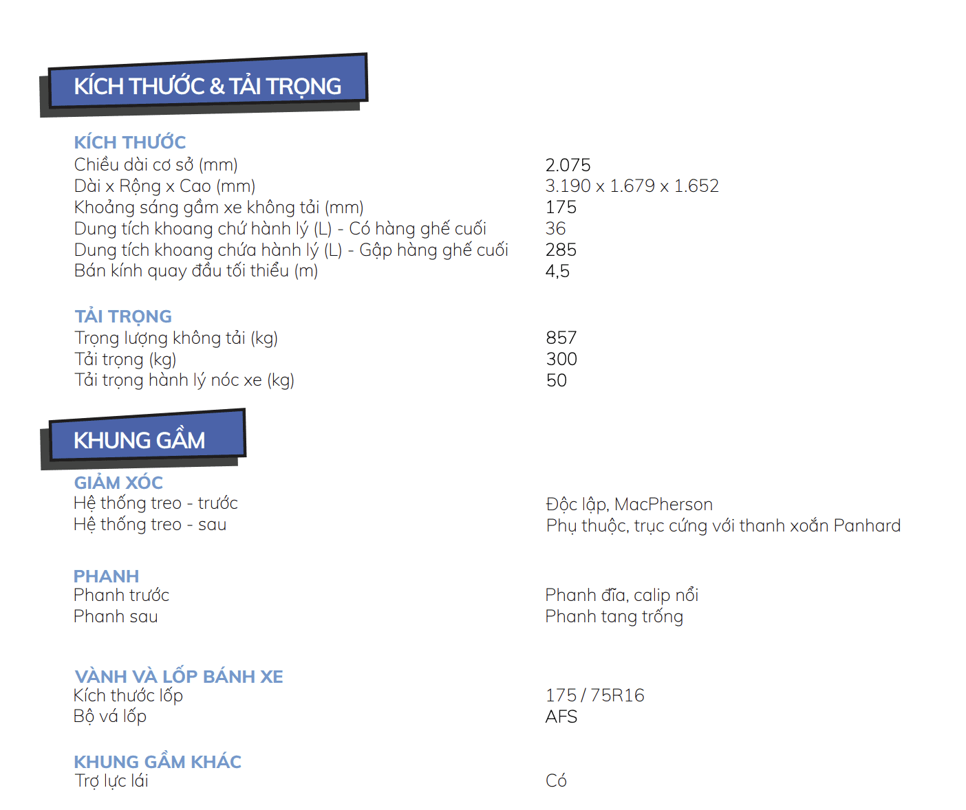 Với khung gầm chắc chắn và túi khí an toàn cho cả người lái và hành khách, giúp giảm thiểu chấn thương trong trường hợp xảy ra va chạm.Thông số kỹ thuật