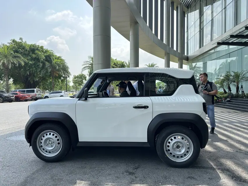 Thân xe Vinfast VF3 chỉ có 2 cửa, kích thước nhỏ gọn nhưng cao ráo. Nhìn từ bên hông, mẫu xe mini car trông khá ngầu với khoảng sáng gầm cao. Gương chiếu hậu, tay nắm cửa và nóc trần đều được sơn đen.