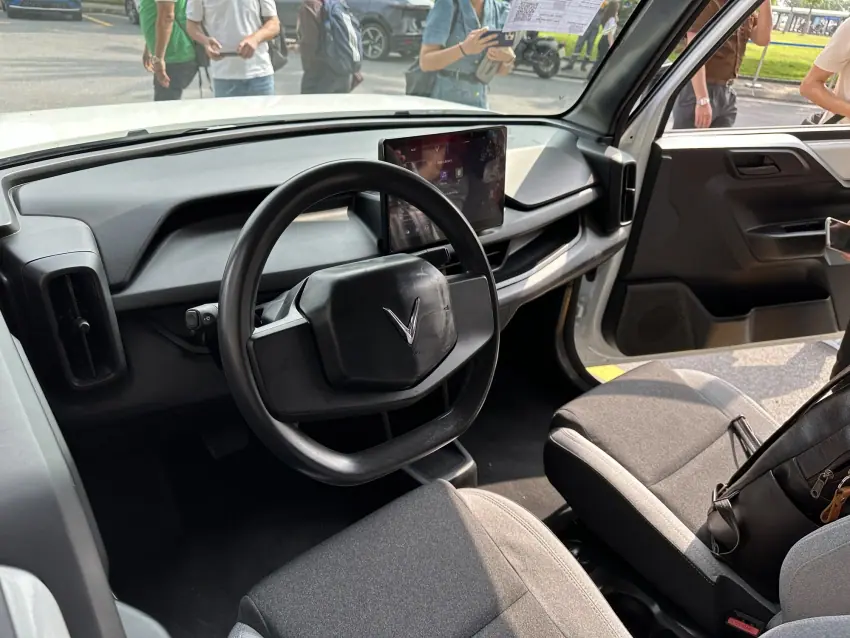 Vô lăng Vinfast VF3 2025 dạng vát đáy, tích hợp các nút điều chỉnh dạng cảm ứng và con lăn. Đồng hồ sau tay lái là màn hình điện tử, kích thước nhỏ 8 inch.