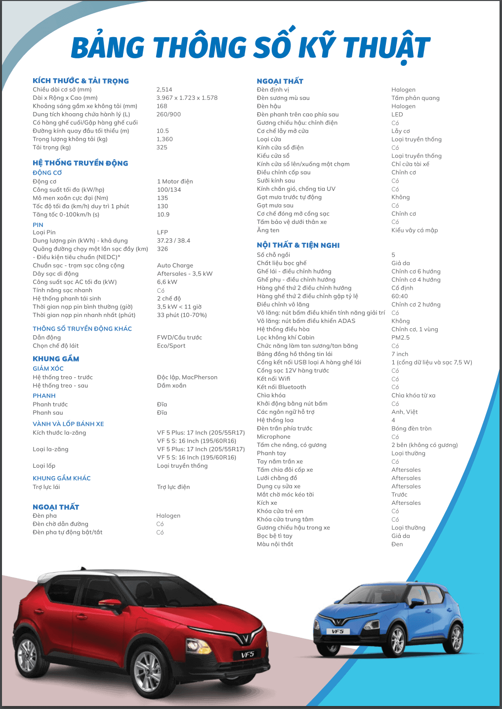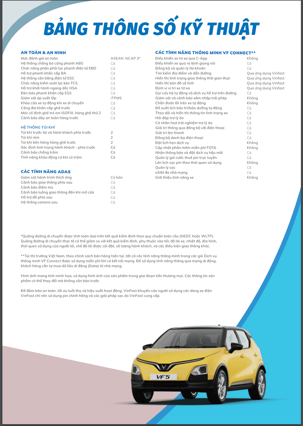 Các tính năng hỗ trợ lái ADAS này chính là sự khác biệt lớn nhất của xe VF 5 Plus so với hầu hết các hãng xe hạng A khác trên thị trường hiện nay, giúp người dùng an tâm di chuyển trên mọi cung đường.Thông số kỹ thuật