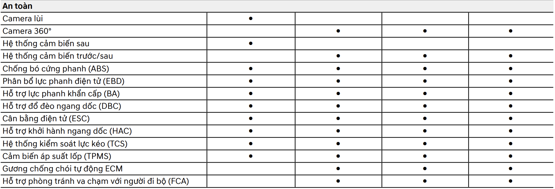 Có 3 chế độ lái Eco - Normal - Sport, mỗi chế độ mang mỗi trạng thái vận hành khác nhau. Bên cạnh đó, chế độ phanh tái tạo và chế độ di chuyển chậm không chỉ là tính năng mà còn là công cụ hỗ trợ người lái.An toàn